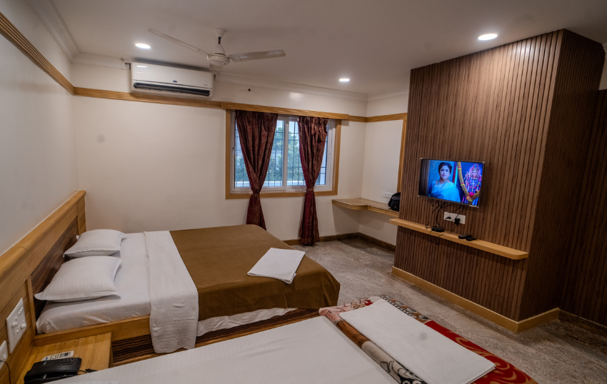 The Triple Bed Rooms are ideal for families or groups, offering generous space and multiple bedding options for up to three guests. Equipped with air conditioning, LED TV, free Wi-Fi, and 24-hour room service, these rooms provide comfort and convenience for a hassle-free stay. The layout ensures privacy and ample space for everyone, while the well-designed bathroom with 24/7 hot water service adds to the overall comfort. These rooms are perfect for guests traveling in groups, ensuring a restful stay with all necessary amenities.